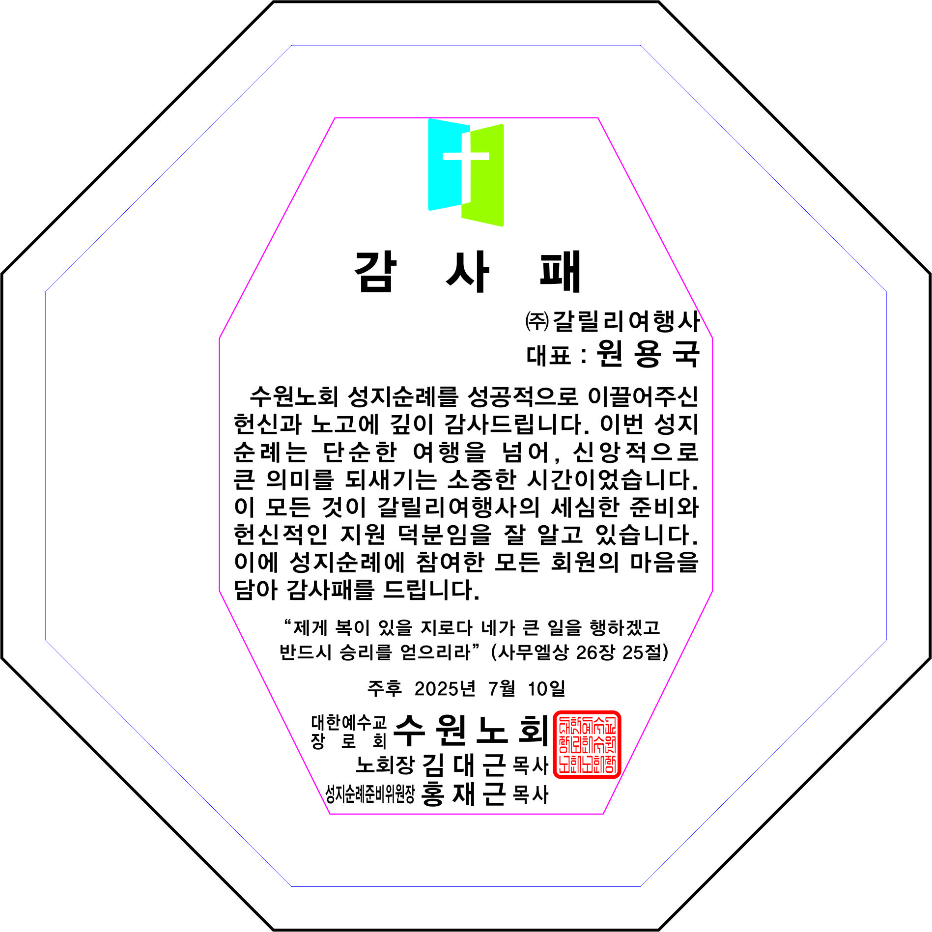그리고 오늘 해단식을 하면서 저희 갈릴리여행사에게 감사패를 주셨습니다.